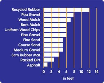 One of the most important factors in surfacing safety is fall height. This is the maximum distance a child could fall from a play structure. The surface beneath must be able to absorb enough impact to reduce the risk of head injury. When installed at the proper depth rubber mulch can protect fall heights up to 10-12 feet, and wood mulch 8-12 feet.